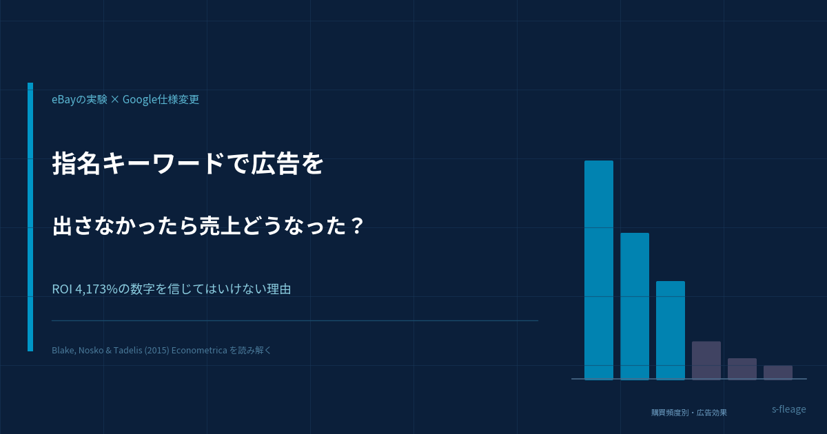 指名キーワード広告に限らず、広告効果の測定において「代理店が出してくるROIの数字」を鵜呑みにすることには注意が必要です。eBayほどの企業が、測定手法の誤りによって効果のない広告に巨額を投じ続けていた。その背景には、ROI 4,173%という数字を疑う仕組みが社内になかったという現実があります。