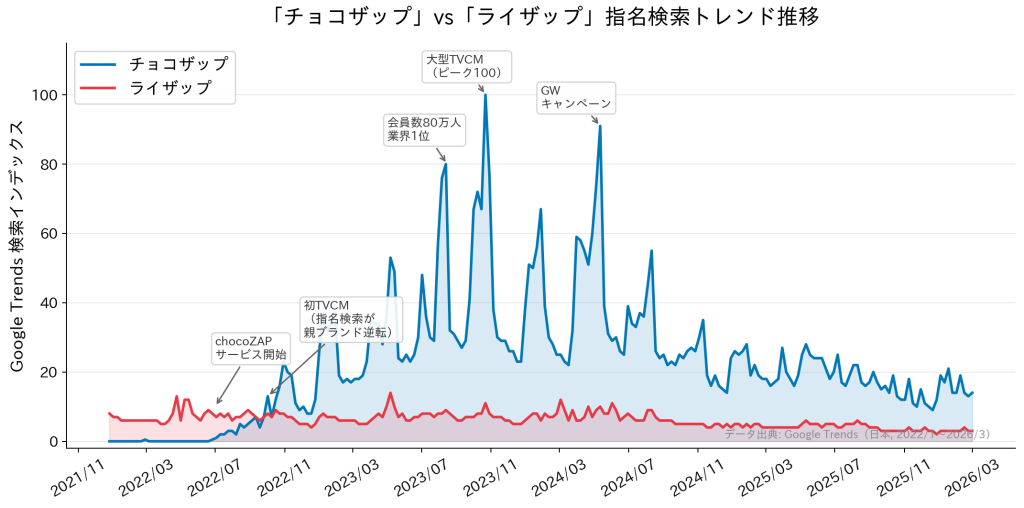 川の流れが変わった、という表現が近いかもしれません。RIZAPグループ全体への関心という「水の総量」はむしろ増えている。しかし「ライザップ」という旧河道は干上がり、「チョコザップ」という新しい河道にすべての水が流れ込んだ。親ブランドの検索需要を子ブランドが完全に吸収するという、ブランドポートフォリオの観点からも興味深い現象です。