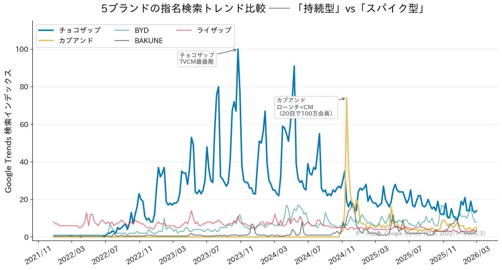 ここで浮かぶ問いがあります。カブアンドもチョコザップも、ともに大規模な広告投下で認知を獲得した。前者は前澤氏の個人ブランドとテレビCMで、後者もテレビCMで。それなのに、なぜ検索の「持続力」にこれほどの差が生まれるのか。