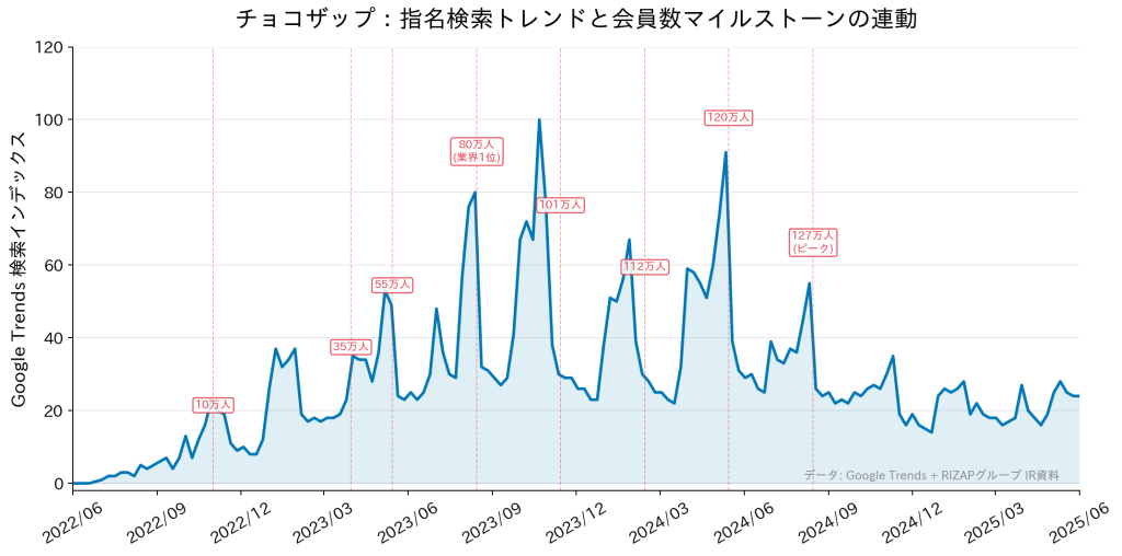 チャート3は、チョコザップの検索トレンドに会員数のマイルストーンを重ねたものです。検索のピークと会員数の急増期が時間的に連動していることがわかります。これは「検索が増えたから会員が増えた」のか「会員が増えたから検索が増えた」のか、どちらとも言い切れない。おそらく双方向の因果──正のフィードバックループ──が回っているのでしょう。